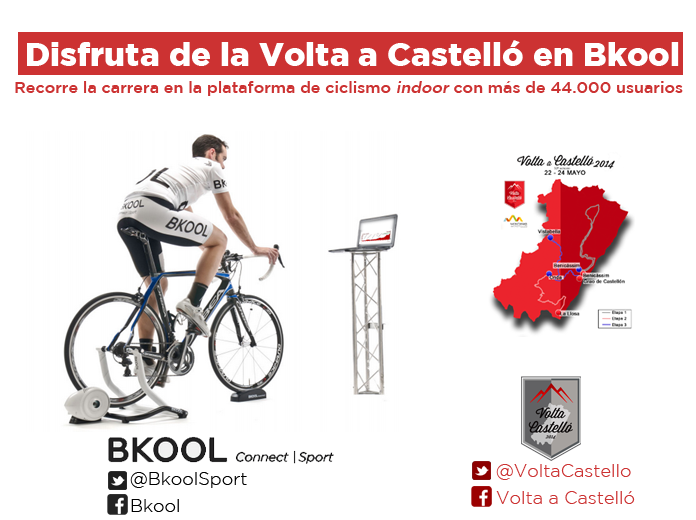 La Volta a Castelló Sub23 2014 se podrá recorrer en la plataforma de ciclismo Indoor Bkool Sport. La organización de la carrera ha llegado a un acuerdo con Bkool para que se registren las etapas con el GPS y se graben en vídeo para después aplicar el aplicar el simulador Bsim y que así sus más de 44.000 usuarios puedan disfrutar los recorridos de la Volta a Castelló.